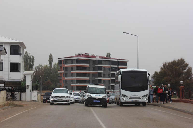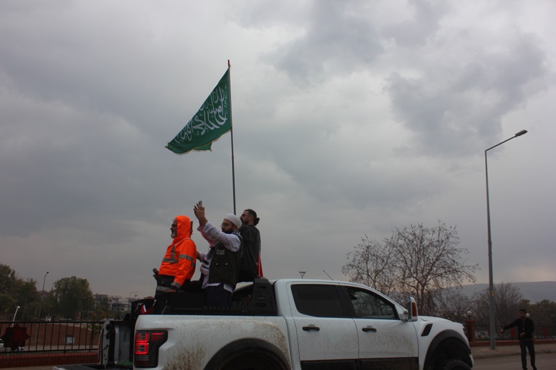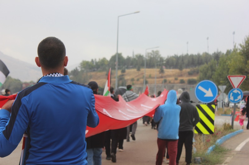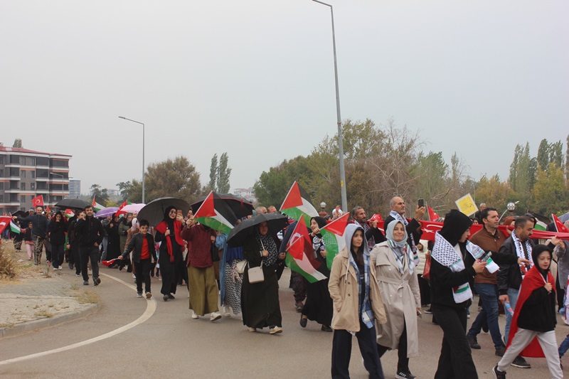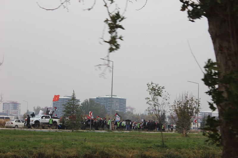 Vatandaşlar sağanak yağışa rağmen boyunlarında Filistin Atkısı,Ellerinde Türk Bayrakları ve dövizlerle sloganlar atarak yaklaşık 2 kilometrelik yolu yürüyerek katettiler.