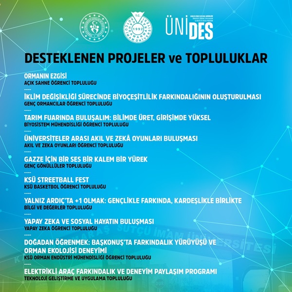 Kahramanmaraş Sütçü İmam Üniversitesi (KSÜ) öğrencileri, Gençlik Hizmetleri Genel Müdürlüğü tarafından yürütülen Üniversite Öğrenci Toplulukları İş Birliği ve Destek Programı (ÜNİDES)’in 5. Döneminde önemli bir başarıya imza attı. KSÜ’den 10 öğrenci topluluğu projesi, yapılan değerlendirme sonucunda destek almaya hak kazandı.