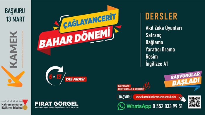 Elbistan, Çağlayancerit ve Ekinözü’nde ücretsiz olarak gerçekleştirilecek eğitim programlarına katılmak isteyen vatandaşlar başvurularını çevrimiçi olarak yapabiliyor. KAMEK kurslarına kayıt yaptırmak isteyenler, https://kamek.kahramanmaras.bel.tr/ internet adresi üzerinden başvuru formuna ulaşarak işlemlerini kolaylıkla tamamlayabiliyor. Kurslarla ilgili detaylı bilgi almak isteyen vatandaşların ise 0552 033 99 51 numaralı WhatsApp danışma hattı üzerinden iletişime geçebileceği belirtildi.